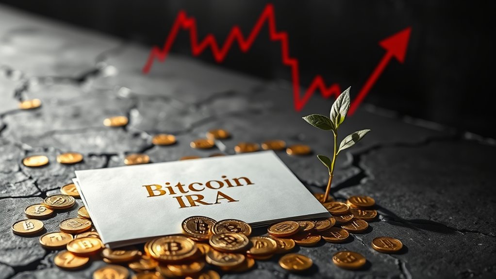 Although market downturns can trigger panic among investors, Bitcoin IRAs provide a crucial safety net that helps mitigate losses during turbulent times. By allowing you to hold cryptocurrency in a tax-advantaged retirement account, Bitcoin IRAs protect your investments from immediate sell-offs. Unlike regular trading accounts, Bitcoin IRAs typically don’t automatically liquidate during a market crash, giving you the breathing room to ride out volatility. This longer investment horizon can shield you from emotional decisions that lead to significant losses. Additionally, the regulatory oversight of Bitcoin IRAs adds an extra layer of confidence, distinguishing them from riskier crypto holdings. In challenging market conditions, Bitcoin IRAs can help you maintain your assets and avoid forced liquidations. Moreover, the concept of long-term investment strategies is particularly beneficial for investors looking to navigate volatile markets effectively.
