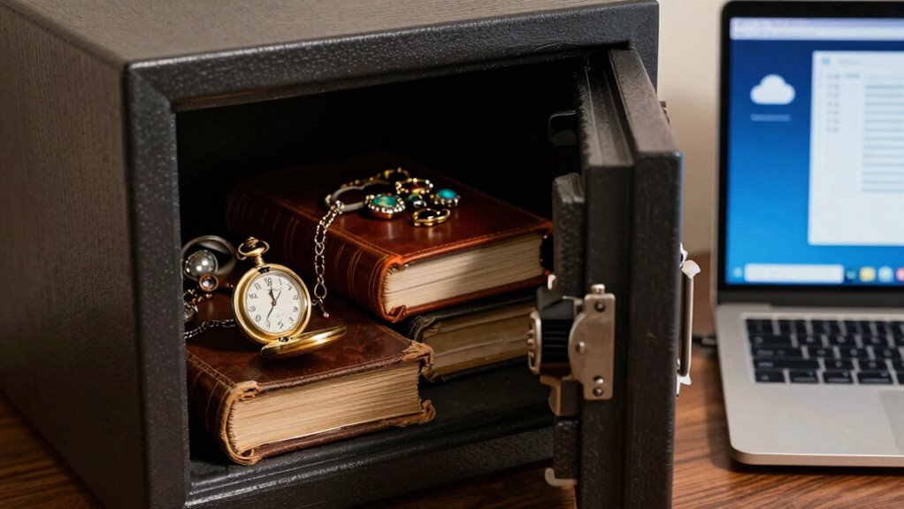 Think of your valuables as seeds—some need shelter in a sturdy safe, protected from storms and thieves, while others flourish best in the digital garden, easy to access yet secure. By wisely choosing what to lock away and what to digitize, you craft a fortress around your most precious memories and assets. With this balanced approach, you create a harmonious symphony of safety and accessibility—your personal sanctuary amid life’s unpredictable weather.