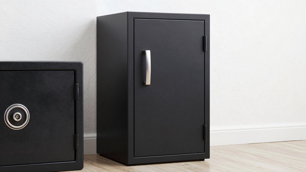 Locking cabinets generally aren’t fireproof like safes because they lack fire-resistant materials and specific fire resistance ratings. Safes are built with fireproof insulation and are tested to withstand high temperatures for set periods, whereas cabinets often don’t have these features. If fire protection is your priority, selecting a safe with a certified fire resistance rating guarantees your valuables stay protected during a fire.