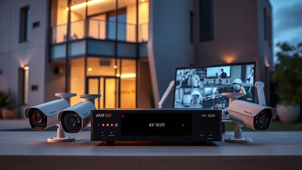Choosing the right resolution is essential because 4K cameras deliver ultra-high-definition footage with 3840×2160 pixels, providing four times the detail of standard 1080p cameras. This high resolution enables clearer identification of faces, license plates, and other critical details from greater distances. It also improves image clarity during night vision or in low-light conditions, thanks to increased pixel density. Opting for 4K resolution future-proofs your system, allowing you to zoom in on footage without losing detail—crucial for evidence collection. However, higher resolution cameras demand more bandwidth and storage, so you’ll need to plan accordingly to guarantee your system performs at its best. Overall, selecting 4K resolution strikes a balance between top-tier image quality and the technical requirements of your setup.