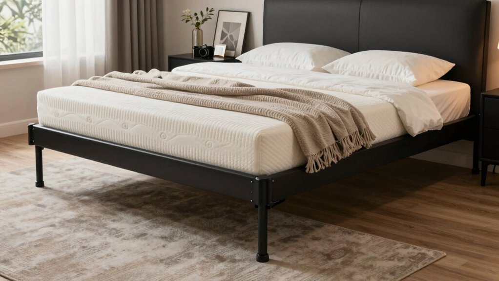When selecting an adjustable bed frame for heavy people, it’s important to take into account how well it supports heavy mattresses. Look for frames with a minimum weight capacity of 750 lbs to guarantee safety and durability. Reinforced steel frames made from high-strength materials are essential, as they prevent bending or breaking under increased weight. The support surfaces, such as slats, should evenly distribute weight, reducing pressure points and preventing mattress sagging over time. Additional features like crossbars and sturdy legs are critical to maintain stability and prevent wobbling with heavier mattresses. Also, make sure the frame is compatible with thicker, heavier mattresses like hybrid or memory foam types, guaranteeing a proper fit and ideal support for your comfort and safety.