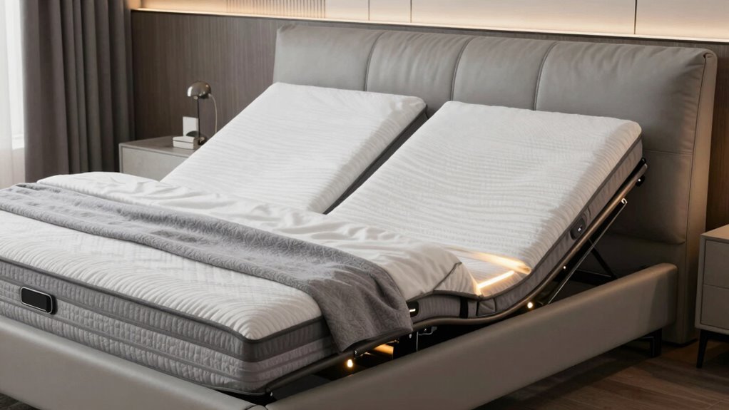 Adding extra comfort features to an adjustable bed frame can considerably enhance your sleep experience. Features like multiple massage modes, such as wave or pulse, target different muscle groups for relaxation and relief. USB ports on each side make it easy to charge devices without leaving the bed, boosting convenience. Under-bed LED lighting provides soft illumination, improving visibility and safety at night. Additional options like zero gravity presets and anti-snore modes work alongside massage functions to promote better sleep quality. Adjustable height settings and built-in side pockets add further personalization and accessibility, making your bed more functional. These features create a more relaxing, convenient environment, helping you wake up refreshed and ready for the day.