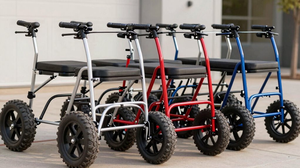 Absolutely, I’ve found some models perfect for rough outdoor terrains like gravel or dirt. These all-terrain rollators typically feature large, rugged wheels that handle uneven surfaces with ease. I recommend looking for models with sturdy frames and wider wheelbases for stability. Brands like Drive Medical and Drive Medical Nitro are known for their durability and performance outdoors. Always check specifications to guarantee they’re rated for the rough terrains you plan to navigate.