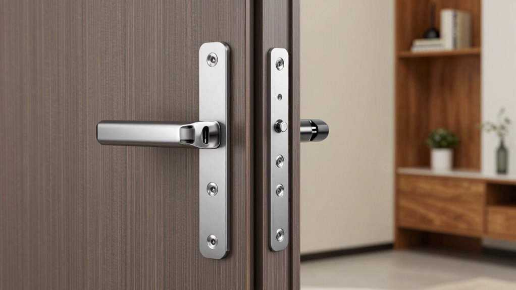 Ensuring your anti-pry door jamb reinforcement kit fits properly requires paying attention to your door’s specific dimensions and features. First, check that the kit matches your door’s thickness, typically 1-3/4 inches for standard doors. Next, confirm that the screw and hole spacing align with your existing lock and hinge configurations, ensuring a seamless fit. It’s also important to verify that the components accommodate your door’s lock type, whether a deadbolt or latch plate. Many kits offer adjustable features or multiple hole options to fit various lock center-to-center measurements, usually between 4.5 and 21.5 inches. Finally, confirm the reinforcement is suitable for your door’s material—wood, steel, or composite—to guarantee a secure attachment and maximum effectiveness.