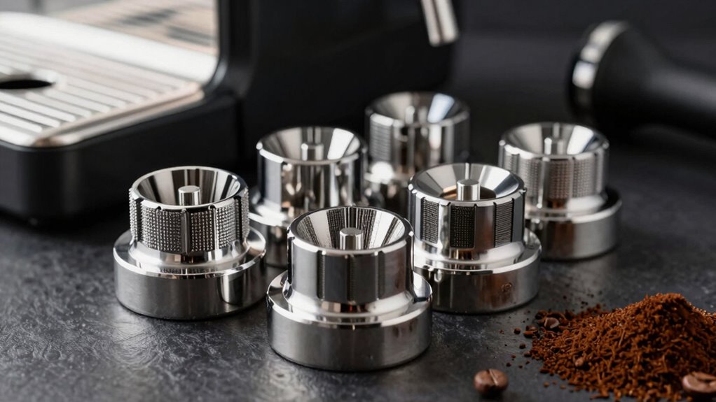 The lifespan of burrs varies by material. Ceramic burrs typically last around 1-2 years with regular use, while stainless steel ones can last 3-5 years or longer if well-maintained. Premium materials like titanium may last even longer, often up to 6-10 years. I recommend regularly inspecting your burrs for wear and replacing them when you notice a decline in grind quality to guarantee the best coffee experience.