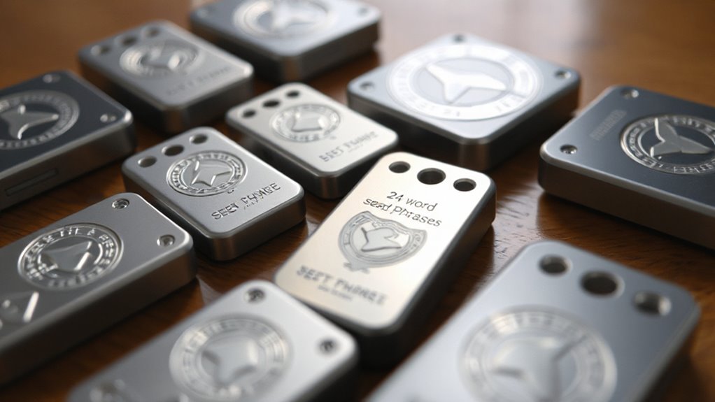 If you’re looking for a reliable way to securely back up your seed phrase, metal plates designed for hardware wallets are an excellent choice. These plates support 12, 18, or 24-word seed phrases, requiring only the first four letters of each word for entry. Compatible with all BIP39 hardware wallets like Ledger, Trezor, and KeepKey, they’re also suitable for various software wallets. Made to withstand fire, water, and physical damage, they ensure your seed phrase remains safe in disasters. Compact and portable, they include letter tiles, screws, and tamper-evident stickers, offering a complete offline backup solution that’s both secure and convenient.