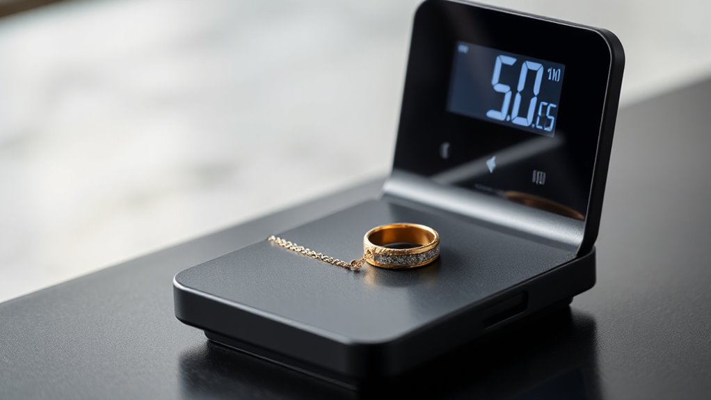 Choosing a digital jewelry scale with a high precision of 0.001g means paying close attention to its measurement accuracy standards. These scales typically have a ±0.001g accuracy standard, which guarantees precise readings for small items like jewelry or gold. To verify this accuracy, calibration weights—such as 20g or 50g—are essential tools. Regular calibration and proper maintenance help maintain this standard over time. Additionally, placing the scale on a stable, level surface is essential for consistent results. Environmental factors like air currents, vibrations, or temperature fluctuations can affect measurements, so using enclosed chambers or wind shields is recommended. Understanding these standards helps you select a reliable scale capable of microgram-level precision, indispensable for professional jewelry appraisal and laboratory use.