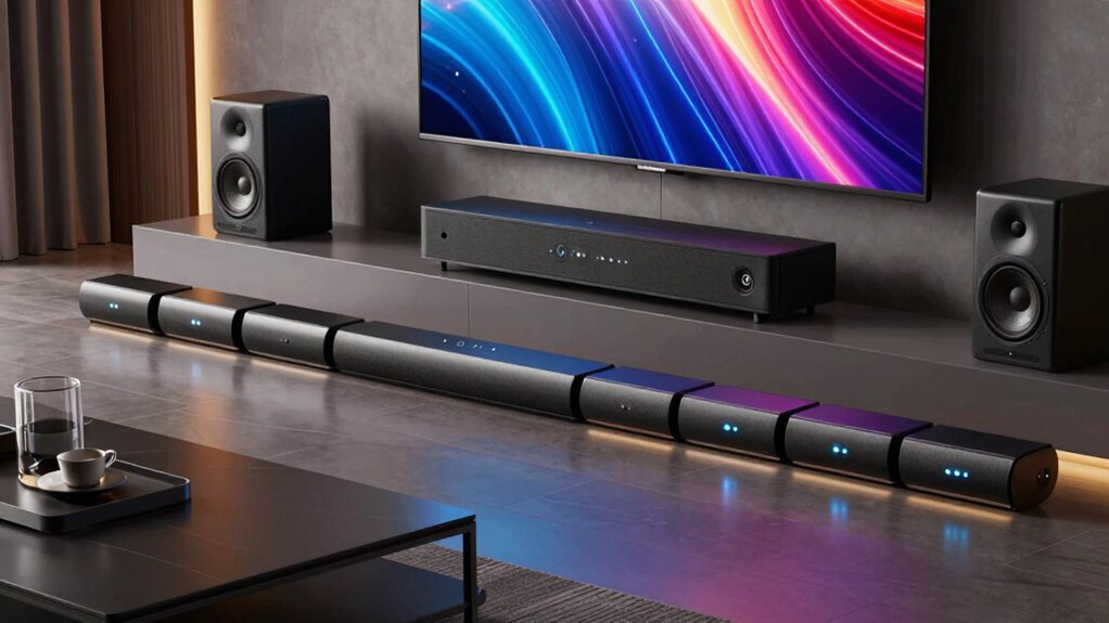 In 2026, I’ve found that the best Dolby Atmos soundbars with subwoofers and rears combine immersive multi-channel setups, powerful deep bass, and sleek designs that fit seamlessly into modern living rooms. These systems support full-resolution Atmos, advanced calibration, and wireless rears for a clutter-free look. They also include smart features like voice control and customizable sound modes. If you want to create a true cinematic experience at home, exploring these options can make a real difference.