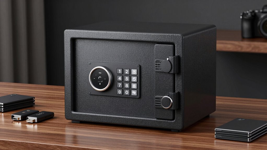 Think of a fireproof safe as a sturdy fortress for your digital treasures. While it shields your SSDs and USB drives from flames and water, it doesn’t guard against electronic data theft. To protect against hackers, I recommend encrypting your data and using strong passwords. Fire safes are great for physical threats, but for digital security, you need a combination of safe storage and cybersecurity measures.