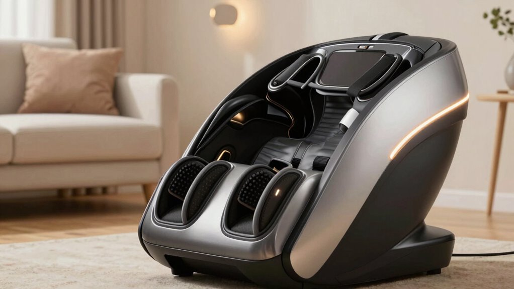 Have you ever noticed how adding heat can substantially boost the relaxing effects of a massage? Many foot and calf massagers offer adjustable temperature settings, usually between 100°F and 122°F, so you can tailor the warmth to your comfort. Some models feature targeted heating zones that focus on specific areas like the soles or arches, enhancing blood flow and easing tension. Multiple heat levels let you choose from gentle warmth to more intense heat, ideal for cold relief. Additionally, some devices provide continuous or intermittent heating modes, ensuring safe, steady warmth without overheating. When selecting a massager, consider how well the heating options complement other features like massage techniques, because the right heat can notably amplify your relaxation and therapeutic experience.