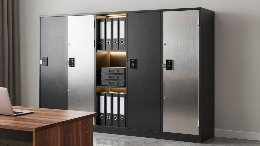 Choosing a home office safe cabinet file storage requires careful consideration of fire and water resistance, as these features directly impact the safety of your valuables during emergencies. Fire-resistant safes can withstand temperatures up to 2000℉, protecting documents and valuables from fire damage. Water-resistant safes prevent moisture infiltration during floods, rain, or spills, safeguarding against water damage. The materials used, like silicone-coated fiberglass, are key to their effectiveness and are often certified by organizations such as SGS and UL94. These safes feature tight seals and reinforced structures to maintain internal safety under extreme conditions. Additionally, their durability is tested through standardized procedures, ensuring they can endure specific heat and water exposure durations, giving you peace of mind during unforeseen events.