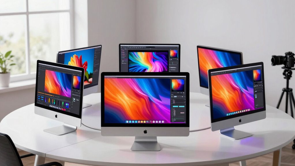 Ample storage capacity and sufficient memory are essential for photographers using an iMac, as they directly impact workflow efficiency and overall performance. A larger SSD, such as 512GB or 1TB, enables me to store large RAW image files without relying on external drives, streamlining my editing process. Upgrading to at least 16GB of RAM boosts multitasking capabilities and guarantees smooth editing of high-resolution photos. Fast SSD read/write speeds considerably cut down loading and exporting times, saving valuable editing time. When I choose models with bigger SSDs and more RAM, I experience better performance when working with detailed images and multiple applications simultaneously. This combination reduces file transfer interruptions and helps me maintain a seamless workflow, especially during intensive editing sessions.