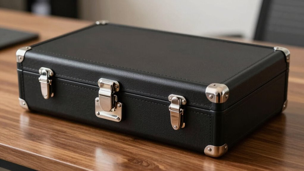 Choosing the right locking mechanism for my portfolio case is essential to guarantee my investment records stay secure yet accessible. I consider combination locks for their simplicity and resistance to losing keys, often using a 3- or 4-digit code. Key locks offer straightforward security but pose the risk of losing or duplicating keys, so I weigh convenience against potential vulnerabilities. Password locks with digital keypads allow me to set and change codes easily, providing flexibility and quick access. Biometric locks, like fingerprint or iris recognition, deliver high security and are tough to hack or duplicate, but they can be more expensive. Ultimately, I balance security needs and convenience when selecting the best locking mechanism for my investment records.