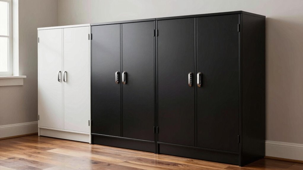 Selecting a lockable storage cabinet that lasts requires paying close attention to the materials used in its construction. High-quality cabinets are usually made from heavy-gauge steel or reinforced metal, which resist daily wear and tear. The finish, such as powder coating or corrosion-resistant layers, further boosts durability by preventing rust and environmental damage. The thickness of the metal, measured in millimeters or gauge, directly affects the cabinet’s strength and longevity. Features like reinforced corners, welded seams, and sturdy handles also contribute to its overall durability. For added security, some cabinets incorporate fireproof or water-resistant materials, protecting your records under extreme conditions. Prioritizing these material qualities guarantees your investment remains secure and functional over time.