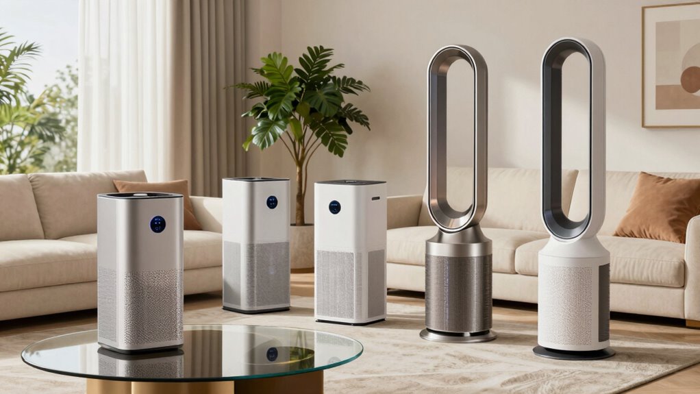 I recommend replacing the filters in luxury air purifiers every 6 to 12 months, depending on usage and air quality. If you notice a decline in performance or increased odors, it’s time to change them sooner. Regular filter changes guarantee peak air purification and help maintain a healthy home environment. Always check the manufacturer’s guidelines for specific recommendations tailored to your model.