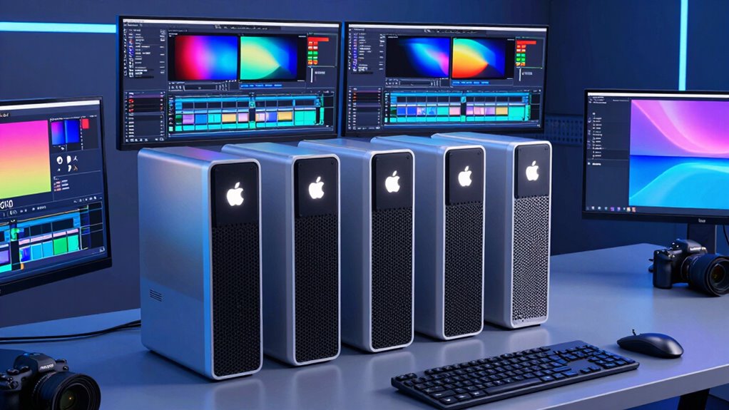 When selecting a Mac Pro for professional video post-production, budget considerations play a critical role in balancing performance needs with financial constraints. Higher-priced Mac models typically feature advanced processors, larger RAM options, and more storage, which are essential for demanding tasks. However, these upgrades come with increased costs. Budget-friendly options may have weaker CPU and GPU performance, leading to longer render times and less efficiency. Upgrading to models with M4 Max chips and 48GB or more of unified memory can boost performance but substantially raise the overall price. Additionally, factoring in expenses for accessories like external drives, high-quality monitors, and expansion ports is vital. Ultimately, balancing initial investment with long-term benefits, such as future-proofing and connectivity, helps make a financially sound decision.