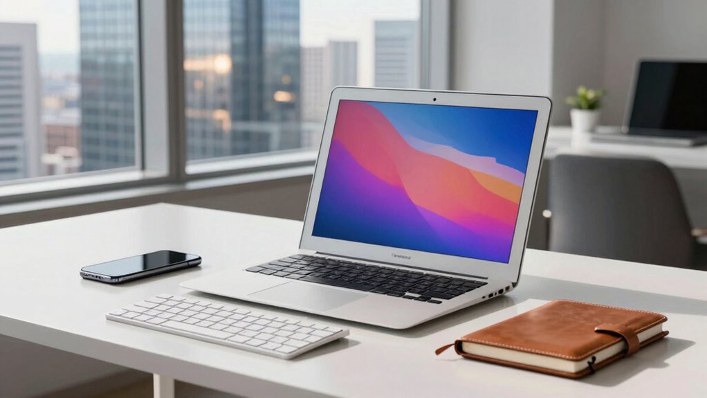 Think of the MacBook Air as a sleek, agile dancer on a busy stage. It can definitely handle enterprise software requirements, thanks to its powerful M-series chips and optimized architecture. I’ve found it smooths through multitasking, complex apps, and even demanding tasks with ease. While it might not be as heavy-duty as a MacBook Pro, it’s more than capable for most business needs, keeping your workflow seamless and efficient.