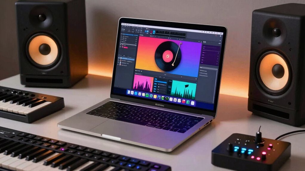 When choosing a MacBook Pro for music production, I focus on several key factors to guarantee it meets my needs. Things like processing power, RAM, and storage affect how smoothly my projects run, while display quality and port options impact workflow and connectivity. Understanding software compatibility is also vital to make sure everything integrates seamlessly.