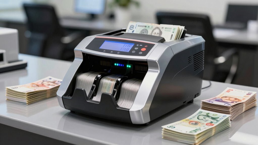 Since the effectiveness of counterfeit detection directly impacts security, it’s vital to evaluate how accurately a money counter can identify fake bills. Detection accuracy relies on the quality and number of technologies like UV, MG, IR, and spectrum analysis integrated into the machine. Reliable models use multiple detection methods simultaneously, reducing false negatives and positives. The field-tested accuracy of these features is often given as a percentage—higher percentages mean more dependable security. Regular calibration and maintenance of sensors are essential to keep performance consistent. Keep in mind, the machine’s ability to spot counterfeit bills varies with the currency’s condition, age, and how sophisticated the counterfeits are. Choosing a machine with proven accuracy ensures better protection against fake currency.