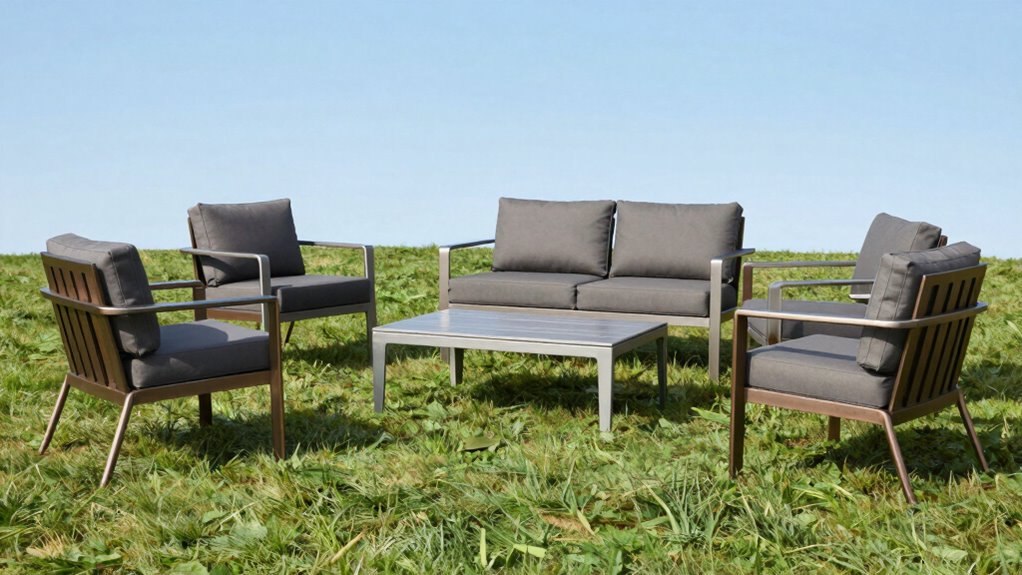 Comfort and ergonomic design play an essential role in selecting the right aluminum patio furniture set, especially if you plan to enjoy extended outdoor gatherings. Well-designed furniture features tilted backrests, supportive armrests, and contoured cushions that promote proper posture and reduce fatigue. I look for high-resilience foam cushions, typically 5 inches thick, which offer lasting comfort and keep their shape over time. Wide seats, often exceeding 26 inches in depth, allow me to stretch my legs comfortably and accommodate different body sizes. Breathable, stain-resistant fabrics like Olefin are also important, as they resist moisture, UV rays, and fading. Ergonomic features, such as wave-shaped contours, help distribute weight evenly, supporting my hips, back, and shoulders for a more relaxing experience outdoors.