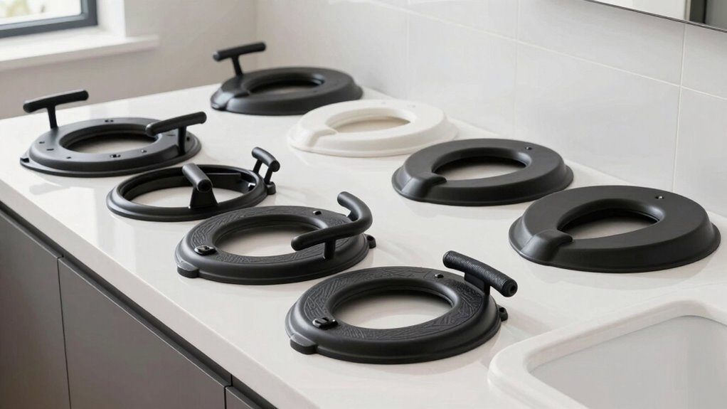 When selecting a heavy-duty raised toilet seat with handles, it’s crucial to take into account its adjustability range to guarantee a proper fit. A good seat should have a height adjustment from about 13 to 25 inches, accommodating different user needs. The width adjustment, typically between 19 to 30 inches, ensures compatibility with various toilet sizes and personal preferences. This broad range allows for better customization, providing a secure, comfortable fit for users of different heights and body types. Adjustable features should include both height and width, making it easy to adapt to different bathroom setups and mobility requirements. Precise mechanisms like quick-release fasteners or telescoping legs are essential for stable, accurate positioning within the specified range.