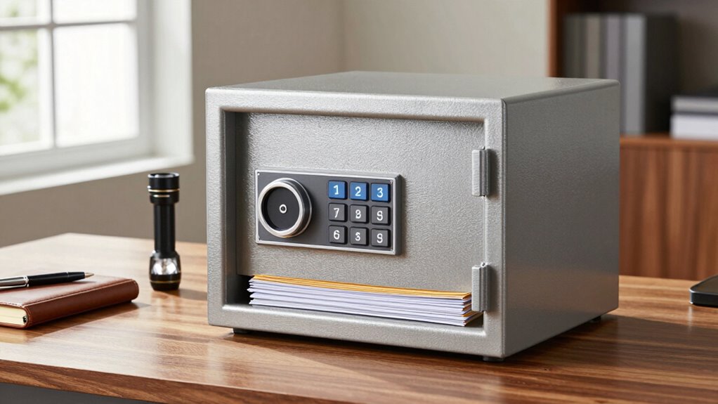 When safeguarding your insurance policies, prioritizing security features is essential to prevent unauthorized access and protect against theft or damage. Look for safes with high-quality locking mechanisms like combination, electronic, or biometric locks to guarantee only you can open them. Tamper-proof features such as reinforced hinges, secure bolts, or drill-resistant designs add extra layers of protection. It’s also indispensable to select safes with certified fire resistance, capable of withstanding extreme temperatures, to preserve your documents during fires. Water-resistant or waterproof safes are critical for safeguarding against water damage caused by floods or firefighting efforts. Additionally, security features like alarms, intrusion detection, or reinforced construction further enhance protection, giving you peace of mind that your insurance policies are well-secured against various threats.