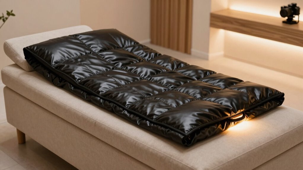 Considering the variety of accessories available can markedly enhance your sauna blanket experience. Many blankets come with extras like thermal wraps, cotton towels, or detox wraps that boost heat retention and keep things hygienic. Some models include remote controls or built-in controllers, making it easy to adjust temperature and timers without interrupting your session. Carrying bags or storage pouches are often included, which makes transporting and storing your blanket simple—perfect for home use or travel. Certain kits feature disposable wraps or thermal reflectors that improve infrared penetration and help maintain cleanliness between uses. Additional features like arm holes or zippers can increase comfort, allowing you to hydrate or read during your session. These accessories can substantially improve convenience and overall effectiveness.