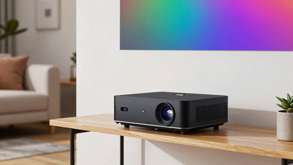 Finding the right space and size fit for a short throw 4K projector is essential for ideal performance in small or confined areas. These projectors can produce a 100-inch screen from just 6.7 to 9 inches away, making them perfect for tight spaces. The throw ratio, usually between 0.18:1 and 0.22:1, tells you how close the projector needs to be to the screen for your desired size. Measuring your room carefully helps guarantee the projector can be positioned correctly without crowding the space. Compact, space-saving designs are great for fitting into bedrooms, apartments, or dorm rooms. Additionally, using flat, dedicated screens and smooth surfaces helps avoid image distortion, maximizing picture quality in limited spaces.