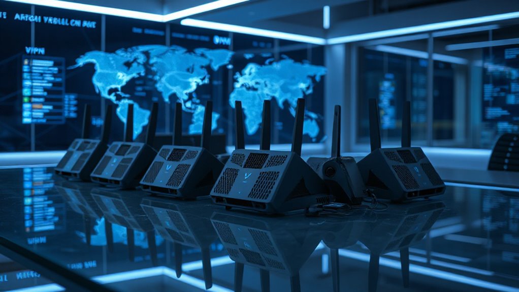 Think of a VPN router as a busy highway with multiple lanes, allowing many cars—devices—to travel securely at once. Yes, these routers support multiple simultaneous VPN connections, keeping all your devices protected and private without slowing down your network. I’ve seen this in action, and it’s a game-changer for anyone wanting seamless, encrypted internet access across all their devices.